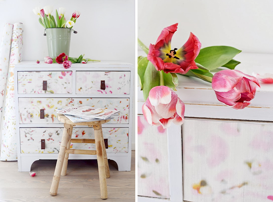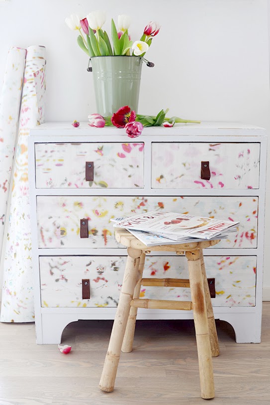 ¿Un cómoda preciosa verdad? Con un estilo romántico envidiable.........realmente irreconocible después de su transformación con tan solo un poco de pintura blanca, papel pintado y unos originales tiradores de cuero.