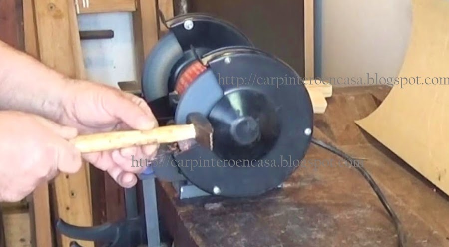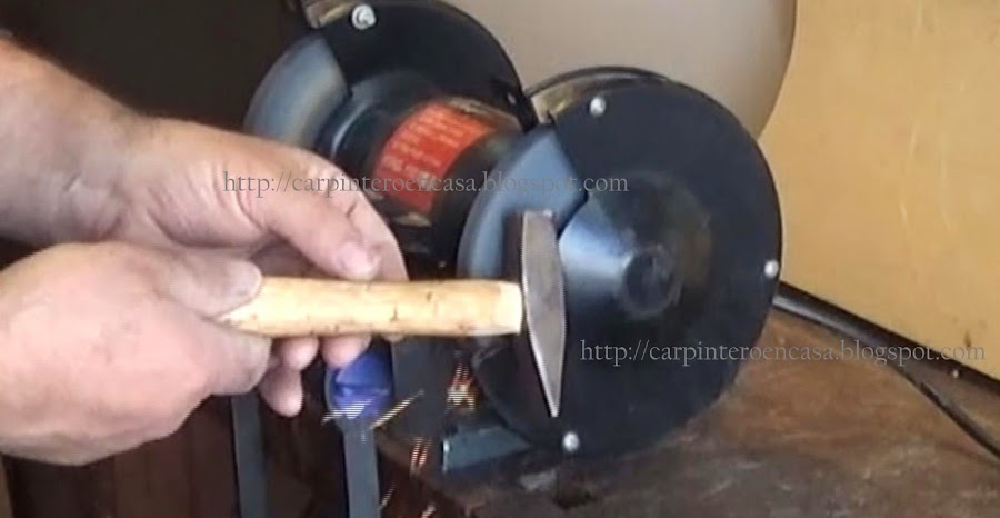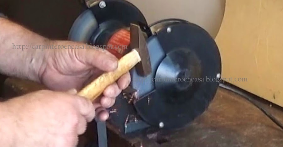 Simplemente corregimos ésto pasándolo por la amoladora de mesa o banco, con la cabeza a 90 grados en relación a la piedra, hasta que desaparezca la comba y quede bien plano.