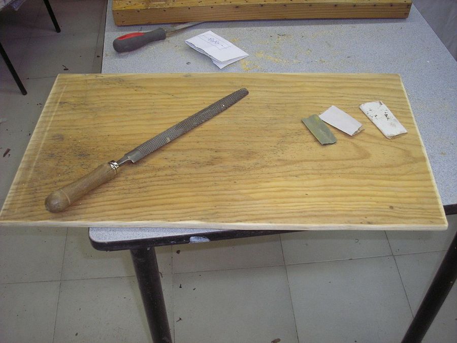 Cortamos la base de madera para la gomaespuma, que hará más cómodo y seguro ir cosiendo los botones. Lijamos bien los bordes.