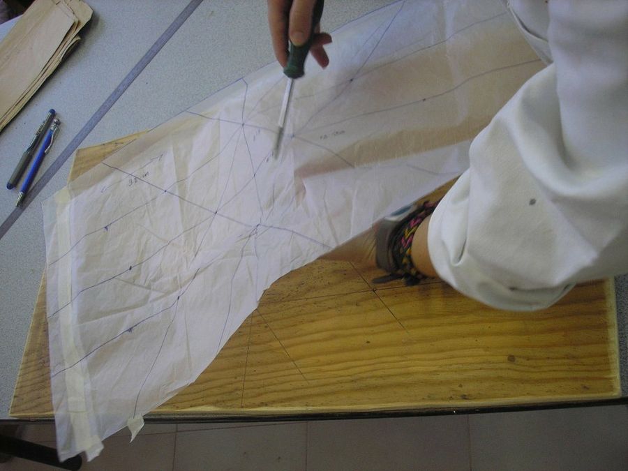 Calcamos el patrón en el soporte, y hacemos taladros para el cordel. En el reverso clavaremos tachuelas junto a los agujeros, para amarrar los hilos.