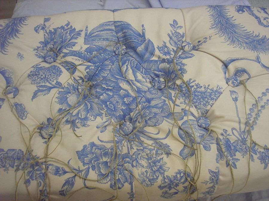 Montaje de la tela definitiva. Rosabel1 ha escogido un refinado diseño ‘toile de jouy’, estampación de origen francés muy apreciada hoy día. Al cortar la tela, nos recuerda la artista, hay que medir con generosidad, ya que debemos hacer los pliegues.