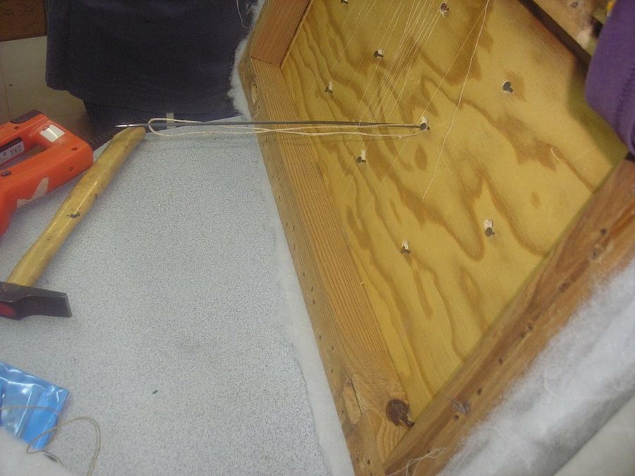 Una tela de sábana sirve de ‘retor’ para iniciar el relieve. Pasamos la aguja sujetando el cordel en las tachuelas, y la volvemos, dejando arriba los dos extremos del hilo.