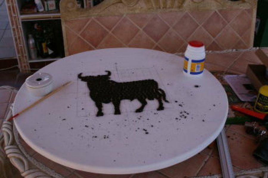 Una vez tenemos el dibujo, debemos comenzar a pegar las piezas del mosaico o teselas, empezando por el dibujo en sí, y rellenando a continuación el resto de la superficie. Con unas tenazas podremos ir recortando las teselas, en caso de necesitar adaptar el tamaño de las mismas por las exigencias del dibujo.