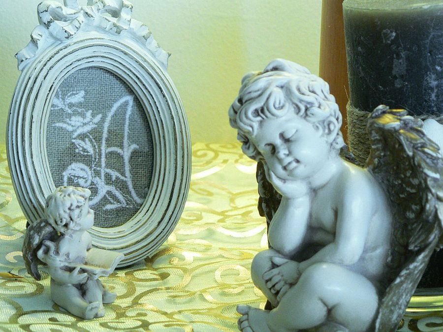 Incluso unas sencillas figuras de marmolina pueden convertirse en ornamentos dignos de un palacio. Cuando Marian-S recibió dos angelitos de Lonara y Petitange, puso toda la ilusión en pintarlos con una refinada librea de colores. Cubrió las alitas con un pigmento acrílico oro viejo, y las lijó cuidadosamente para que asomara la base blanca. Después elaboró una pátina con tinte pardo y cera, con la que embadurnó las figuritas. A continuación las humedeció con aceite de oliva, y matizó los relieves del cabello y las alas con la misma pátina. Acabó la tarea dando cera transparente de anticuario. Después de abrillantar con un paño, obtuvo un regalo muy apropiado para Navidad.