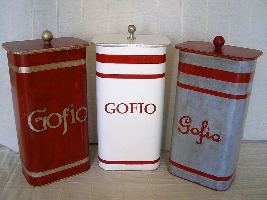Martajinaste nos brinda otra excelente idea para regalar. Estos preciosos botes de cocina son latas de aceite: una vez pulido el borde con una Dremel, nuestra lectora las pinta, les marca unas elegantes franjas ayudándose con la cinta de carrocero, y finalmente les hace una tapa de madera. Sólo queda ponerles el rótulo, confeccionado con diversas tipografías de Word.