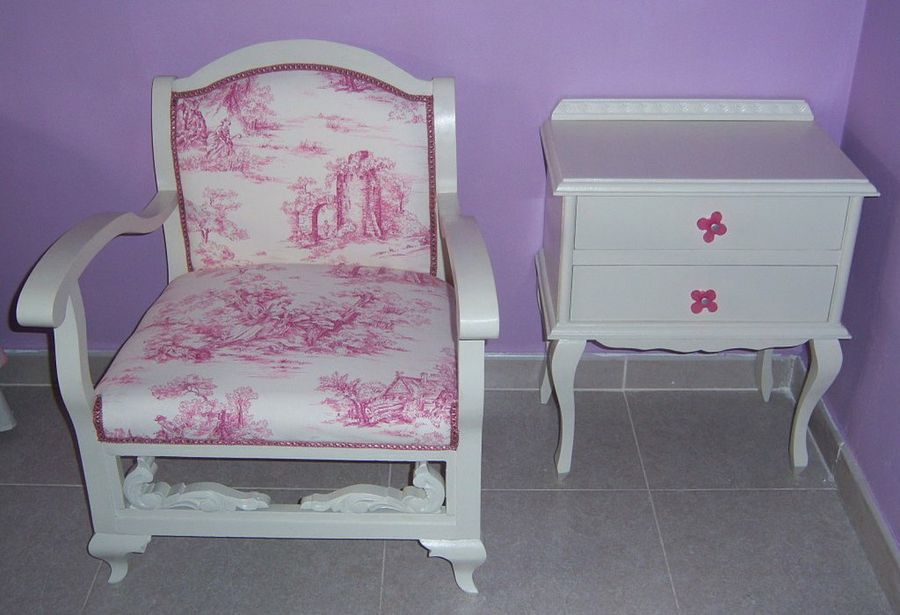 Y como ejemplo de regalo verdaderamente maravilloso, nos complace recoger uno de los mejores trabajos del año en el foro de Bricolaje. La butaca de Rago era un trasto polvoriento, que ha sido increíblemente rejuvenecido y embellecido por nuestra lectora. La magistral labor de pintura después de la restauración se completa con el exquisito tapizado en ‘toile de jouy’. Rago decoró a juego una mesita antigua de su abuela, en un conjunto destinado al cuarto de la princesita de la casa.