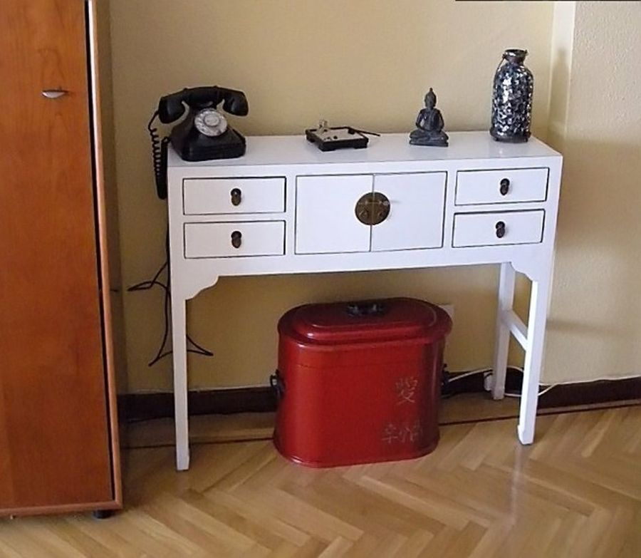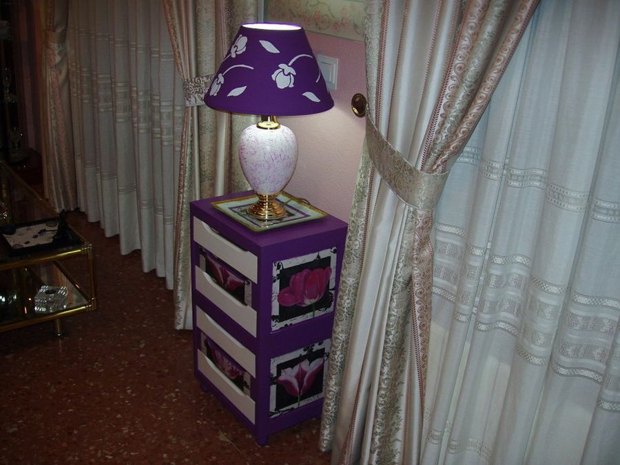 El buen gusto y la destreza de Angel-o-demonio forman una combinación insuperable, que la artista ejercita sin descanso en los adornos más variados. Aquí vemos el armonioso grupo decorativo compuesto por una cajonera pintada en alegres motivos grandes, lo que genera una atrevida armonía que sintoniza muy bien con la lámpara. ¡Todo un acierto, enhorabuena!