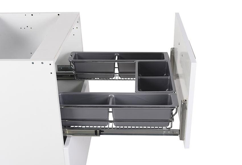 3. Por lo general, el mueble de debajo del fregadero suele ser un espacio abierto, sin cajones, baldas o compartimentos, lo que hace que de desaproveche mucho la altura del mismo, pudiendo emplear solamente la base del mueble. Para solucionarlo podemos instalar bandejas extraíbles, que se colocan con el mismo sistema que un cajón.