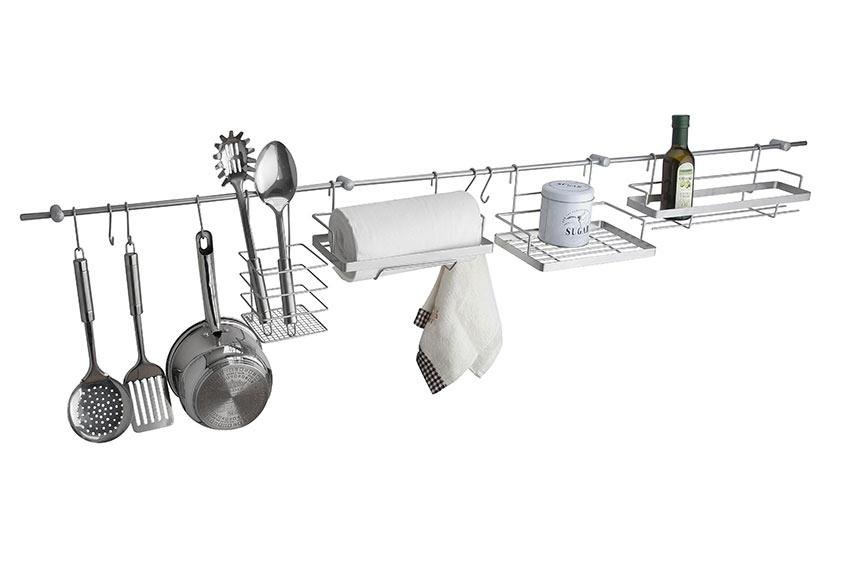 6. Tener la encimera despejada es, sin duda, otra de las claves que va a dar sensación de orden en la cocina. Por esa razón, si no tenemos suficiente espacio de almacenaje para guardarlo todo, vamos a aprovechar las paredes. ¿Cómo? Muy fácil, instalando una barra sobre la que podemos colgar diferentes tipos de accesorios diseñados específicamente para los elementos propios de este tipo de estancias: el rollo de cocina, las cacerolas, las espátulas, la sal, las especias...