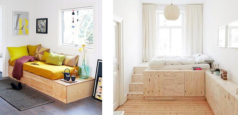 Así es: aunque ya muchas camas traen de por sí este tipo de cajoneras, también tú podrías intentarlo haciéndolas independientes de la base de la misma con un poco de trabajo sobre madera. Lo idea es que no se note la diferencia de los espacios entre un objeto y otro tal y como lo ves en la imagen, sino que por el contrario se sienta como un todo puesto a propósito.