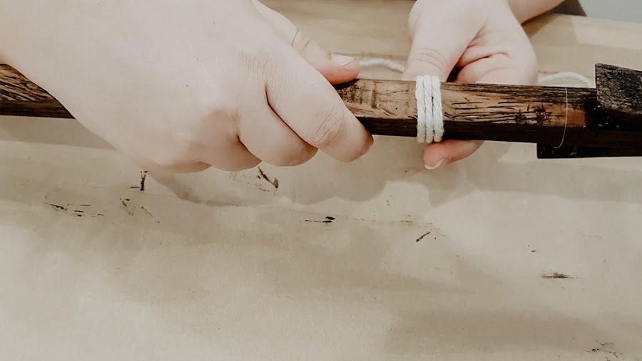 Y para terminar, le hemos añadido unos trozos de cuerda para que quede más bonita. Con la ayuda de una pistola de silicona caliente añadimos un poco en la parte trasera, apoyamos la cuerda y la empezamos a enrollar. Cuando la tengamos, cortamos el sobrante de la cuerda y la fijamos con otro punto de cola.