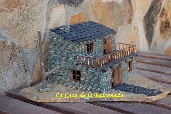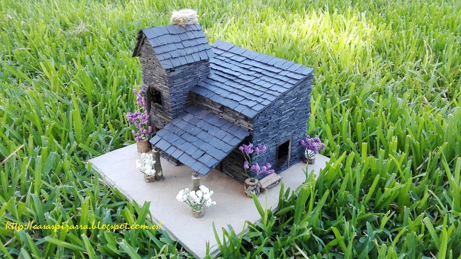 Sobre una lasca de pizarra de 55 cm por 33 cm. la casa mide 26´5 cm. de ancha, 16´5 cm. de fondo y 11 cm. de alta.