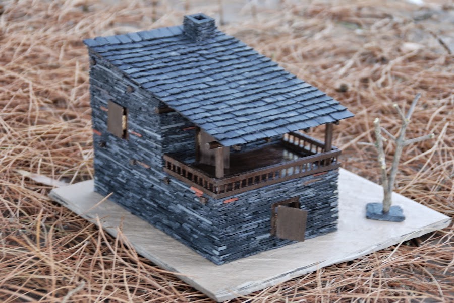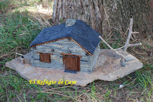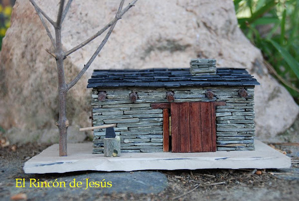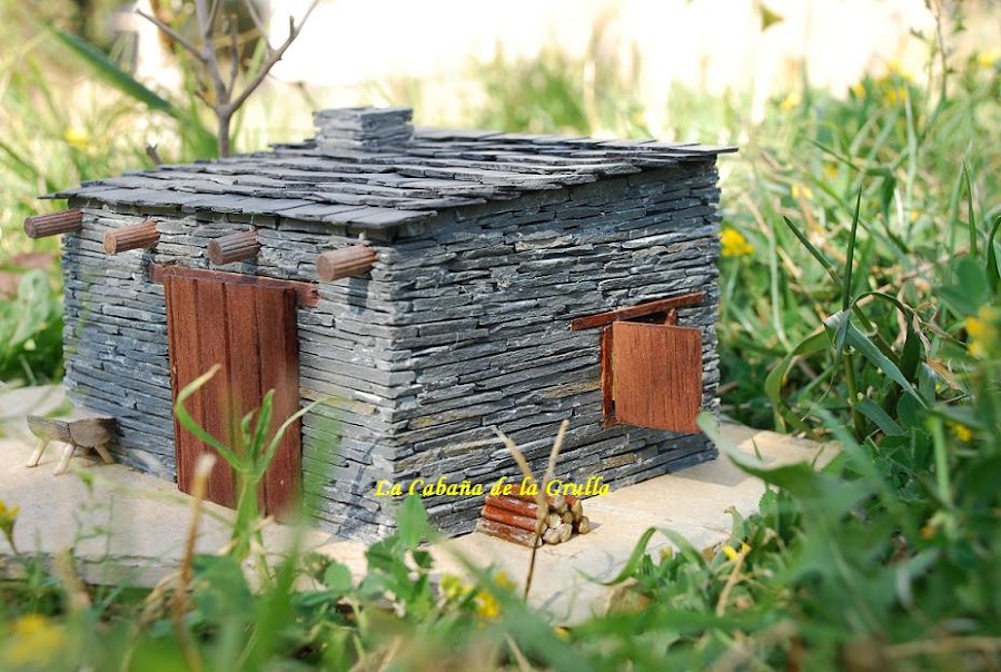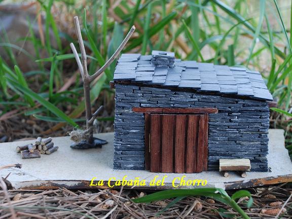 Construida sobre una teja de pizarra de 39´5 cm por 20 cm. La cabaña tiene unas medidas de 19 cm. de larga, 14 cm. de ancha y 10 cm. de alta.