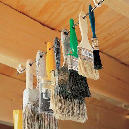 Aprovechar bien el espacio vertical es una muy buena idea para guardar herramientas y utensilios. Utilizar colgadores de pared o para colgar de estanterías puede solucionar problemas de espacio mientras a la vez mantiene visibles las herramientas que necesitas tener más a mano.