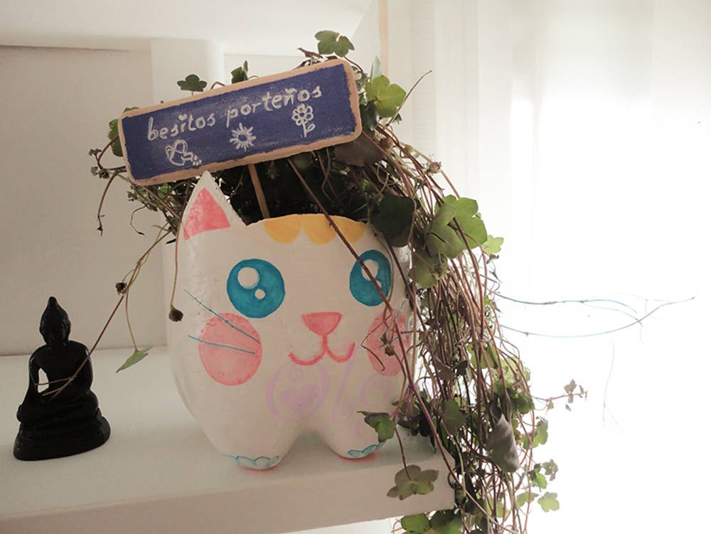 En el Tocador de Cenicienta hace un macetero con forma de gato (que me encanta) al que luego le añade un cartelito, pintado con Chalk Paint :)