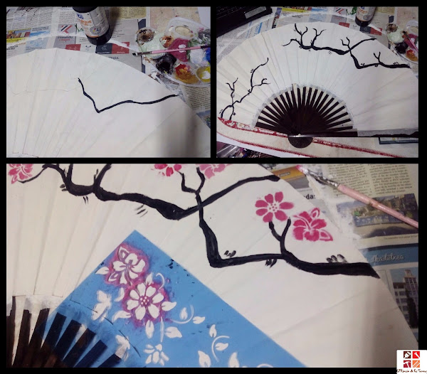 Después con una plantilla de stencil dibujé algunas flores, aunque tengo que decir que no quedaban muy bien ya que los pliegues del abanico no me dejaban profundizar mucho con la pintura y se salían pegotitos .