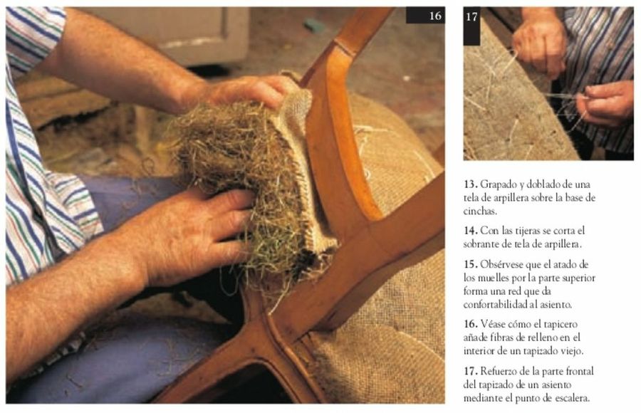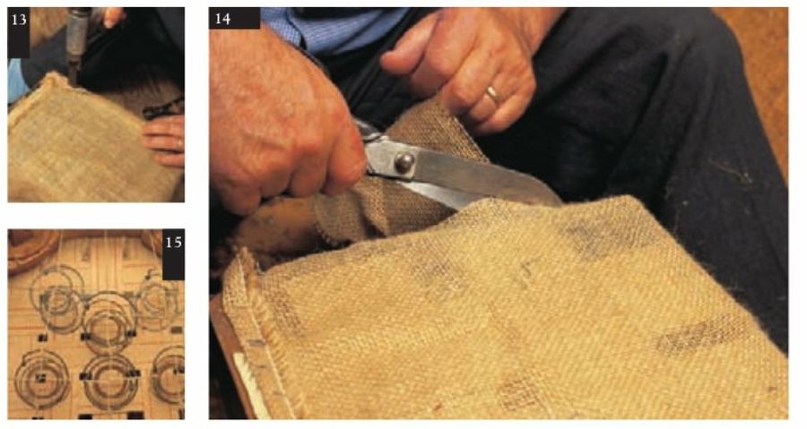 A veces hay asientos que tienen las cinchas colocadas por la parte superior, con lo cual no necesitan muelles. Si la base del tapizado está en buen estado, sólo será necesario cubrir la superficie de las cinchas con tela de saco. Para ello, se grapará la tela sobre la madera, procurando hacer los pliegues en los extremos con el fin de reforzarla. Una vez que se hayan fijado dos de los lados en forma de ángulo, podrá cortarse la tela con unas tijeras. Es fácil seguir el corte empleando como guía el perfil del asiento.