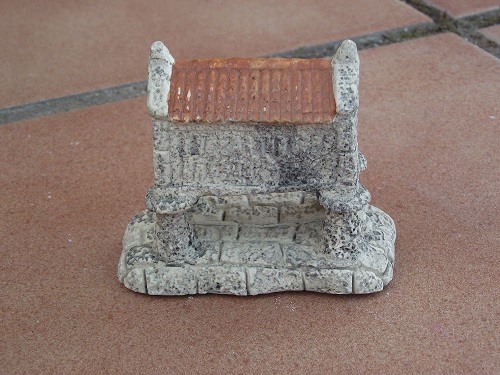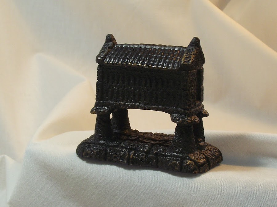 Un hórreo de escayola, que debió ser un recuerdo de alguien que fue a Galicia, y que llevaba rodando mil años por el mueble del comedor. Lo pinté con la pintura de forja y después le apliqué cera dorada con el dedo por las partes salientes. Para terminar barniz satinado y así quedó, con un aspecto metálico total, ¡¡aunque al cogerlo siga pesando igual que antes jaja!!