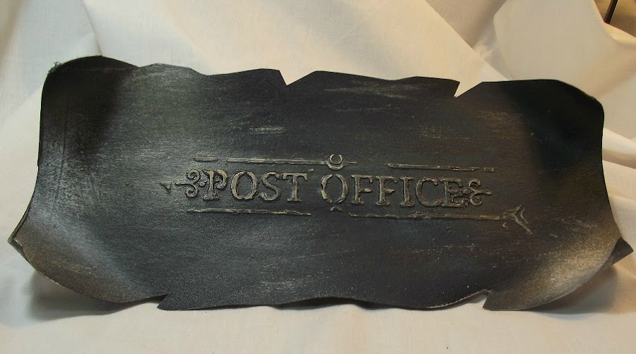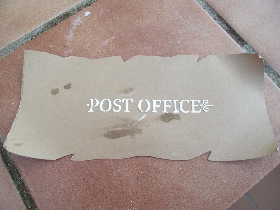 Un letrero hecho con cartulina, al que recorté los bordes y doblé las esquinas para simular un letrero de hierro antiguo. En el centro hice un estarcido en relieve con esta plantilla, también de la tienda: