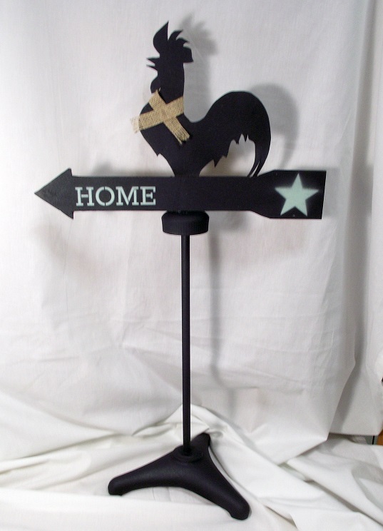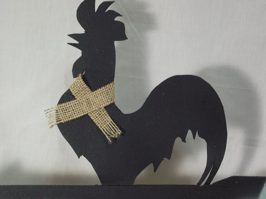 Puesto que la veleta no iba a funcionar como tal pues me pareció que quedaría más decorativa indicando la dirección de casa. Al gallo Kiriko le puse una bufanda de arpillera, aunque él mantiene su postura erguida a pesar del frío:
