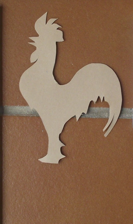 El gallo Kiriko está recortado dos veces en un cartón muy finito y pegado, para que quedase con un poco más de cuerpo: