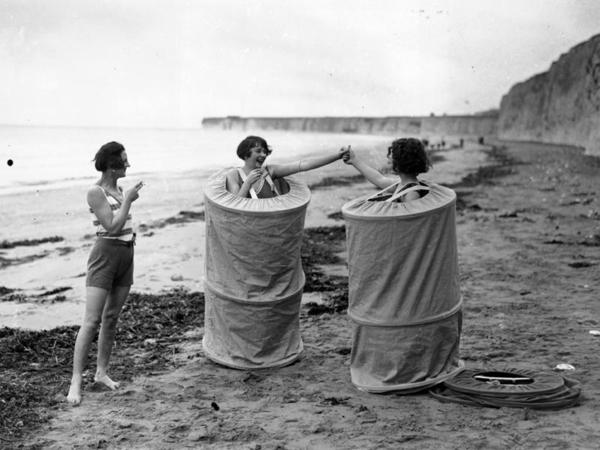 El último grito en la moda playera de 1920 fue la skreenette, una especie de saco con estructura tubular en cuyo interior las mujeres se quitaban el bañador y se cambiaban de ropa sin temer miradas indiscretas... es como cuando ahora entre dos sujetamos unas toallas a modo de cambiador improvisado, pero mucho más currado e imagino que bastante más incómodo de transportar jajaja