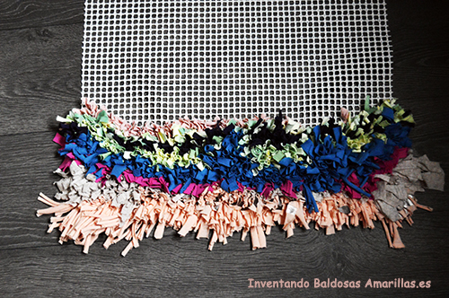 ¿Por qué pongo el tutorial antes de terminarla? Porque muchas veces vemos cosas en internet, en tiendas o en casas de nuestras amigas que nos parecen una preciosidad. Nos enamoramos y queremos hacerlas. Pero también muchas veces no nos cuentan las dificultades o problemas que pueden aparecer durante el proceso. En este caso para mí hay dos cosas importantes a tener en cuenta: el tiempo y el material. Para hacer unos 15 centímetros de alfombra llevo más de un mes cortando camisetas y poniendo trapillo en la rejilla de goma. Es muy fácil de hacer, pero lleva tiempo.