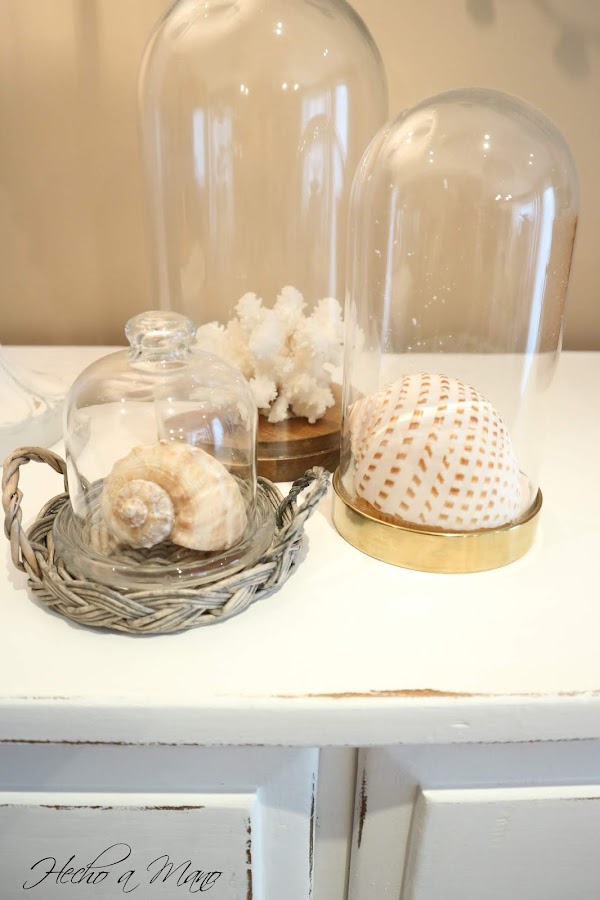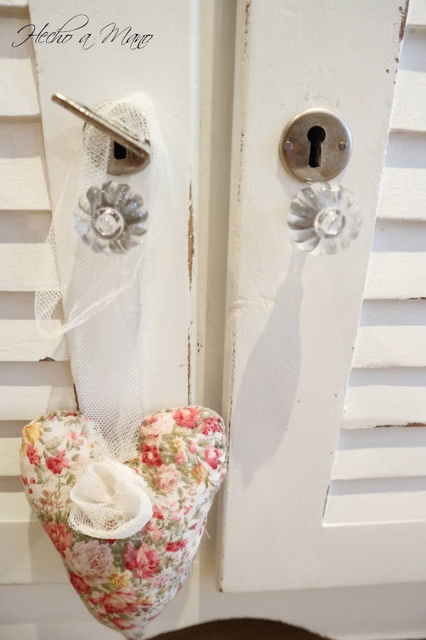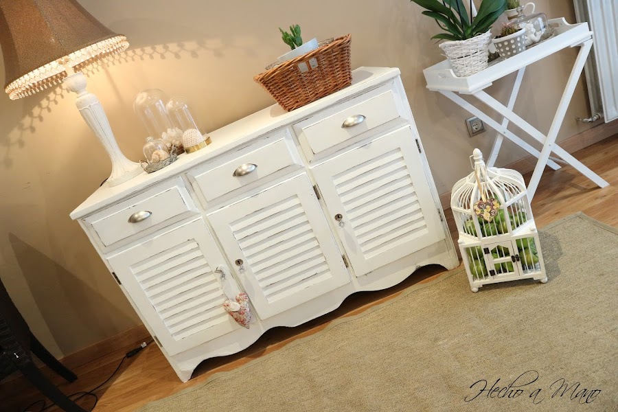 Sustituí los deteriorados tiradores por unos de de los llamados de concha en los cajones y de otro modelo, de cristal, en las puertas. Me ha apetecido romper un poco y que fueran diferentes. Por supuesto, bisagras nuevas y embellecedores de las cerraduras.