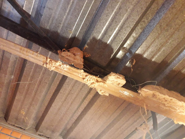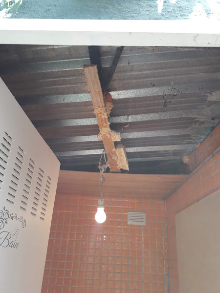 Aqui podeis ver la "ingenieria" con la que montaron el techo y eso iba cubierto con laminado cutre de suelo. En la primera foto del antes creo que se puede apreciar.