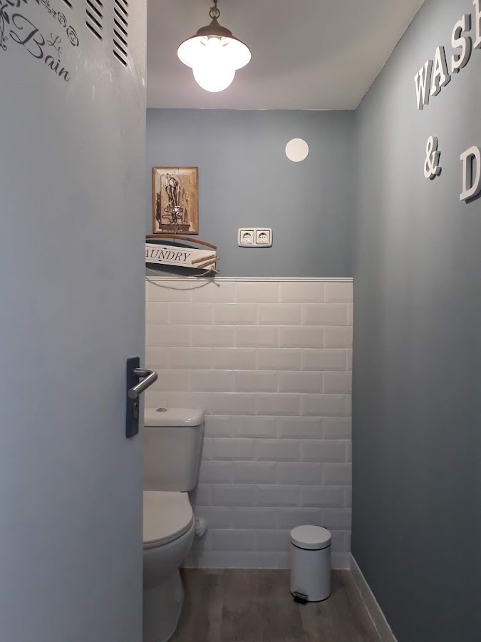 Mi santo varón es fontanero y soldador entre otras muchas cosas, asi que hizo la instalación del lavabo y el mini termo que va a ir tambien en ese lado detras de la puerta. El wc se movió unos cms. a la izq. y así queda el espacio a la dcha. de las fotos según las veis para la lavadora y la secadora en columna