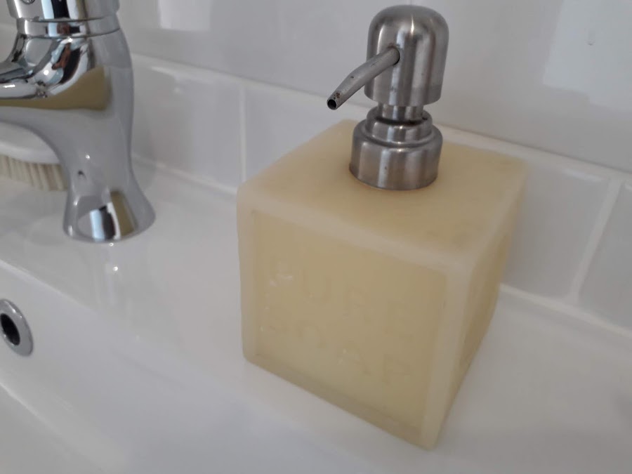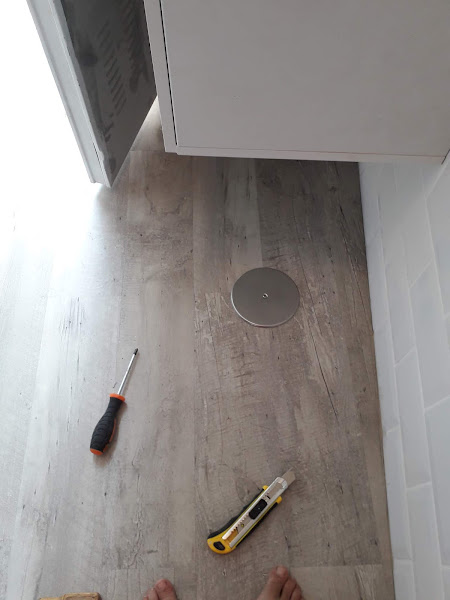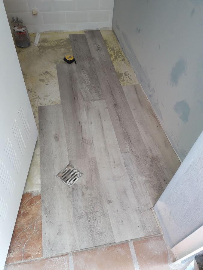 El suelo comprado en Leroy Merlin, un vinílico adhesivo imitación madera que para ese lugar va perfecto pensando que es un aseo que solo se usa en verano cuando estas saliendo y entrando en la piscina, cómodo de limpiar y mantener y cómodo de colocar, aunque hay que poner atención cuando lo colocas para que las lamas vayan en la direción adecuada y no se noten las juntas nada mas que por el dibujo y si tenemos que cortar las piezas porque sobra material en determinadas zonas, aseguraros de no unir una cortada con una nueva, por muy limpio que sea el corte, se nota chicas...