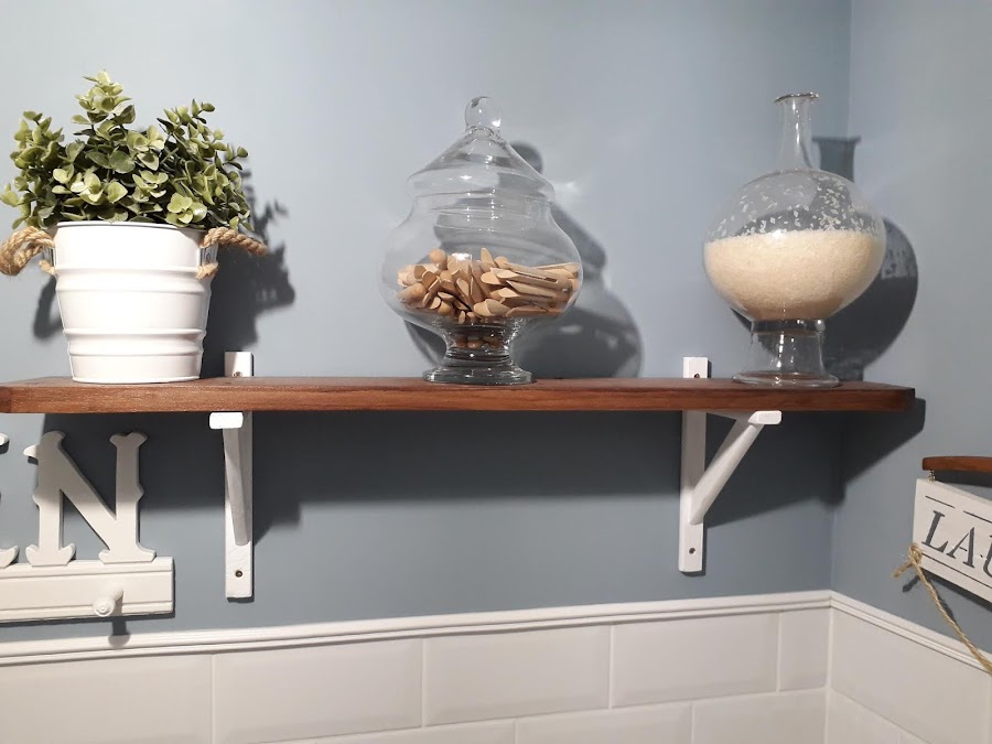 Balda hecha con palet, teñida y barnizada con escuadras en blanco que mi marido cuando se lo dije no lo visualizaba y luego ya puesta si le gustó, idea sacada de Pinterest