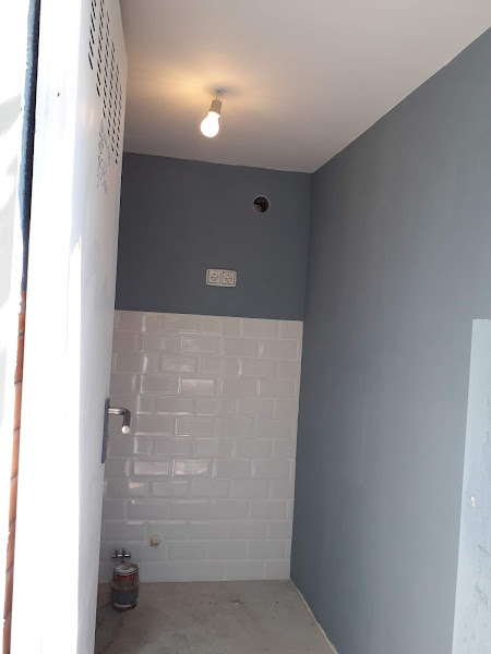 Primera mano de pintura, la misma que la de las fachadas exteriores pero aclarada con blanco, porque al ser un espacio tan reducido lo que interesa es claridad... No me digaís que no se va viendo bonita la cosa