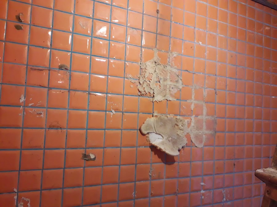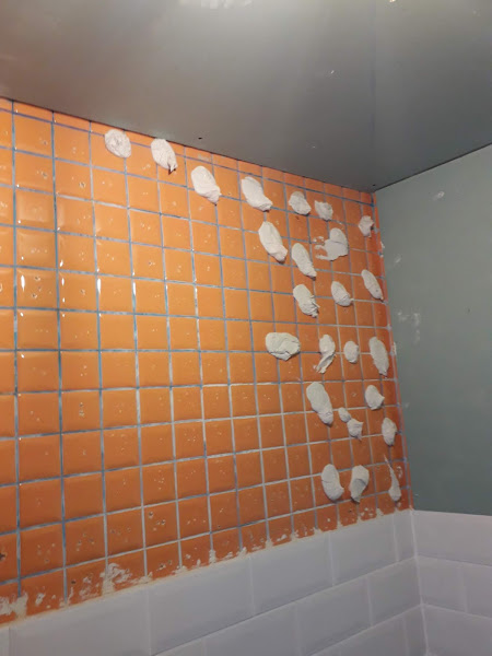 Toca pladur. Pero antes y por si las moscas, como era la primera vez que ibamos a colocar pladur sobre alicatado y aunque nos habian dicho que pegaria bien, mi marido dijo que mejor dabamos unos picotacitos con los martillos en las paredes para que agarrara mejor el adhesivo, asi que dicho y hecho y darle, solo desconchar un poquin...