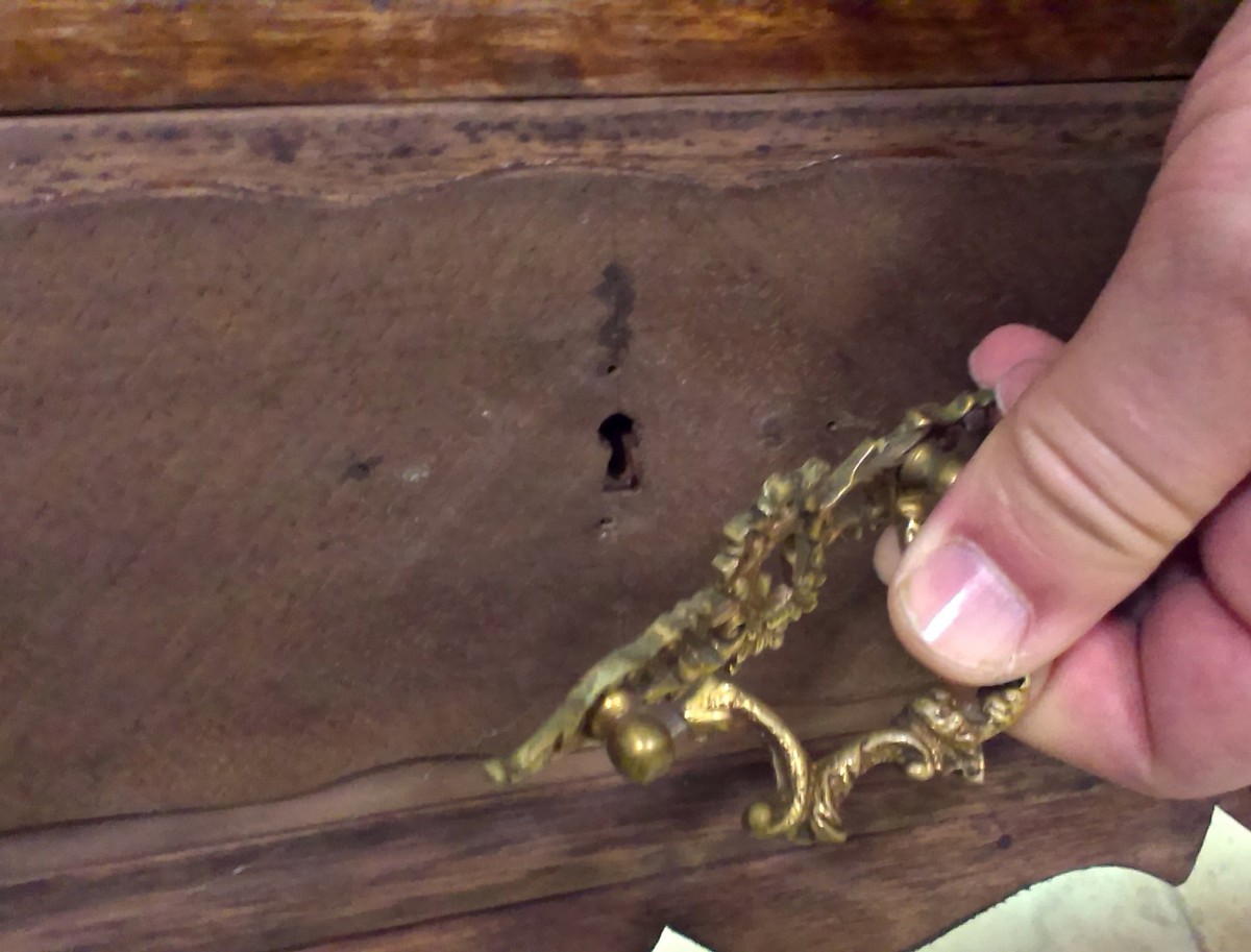 Procedimos a retirar los herrajes para limpiarlos y darles una pátina azul verdosa imitando al óxido del bronce.