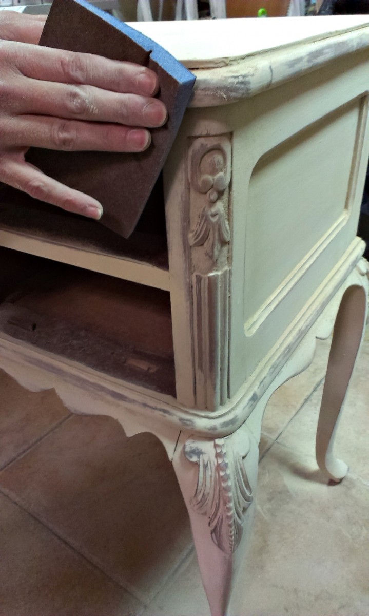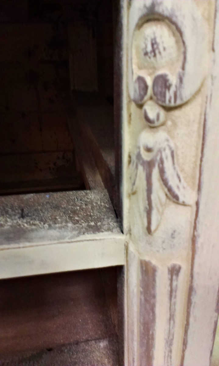 Cuando secó lijamos las esquinas y molduras para destacarlas.Dejando ver el tono oscuro de la nogalina.