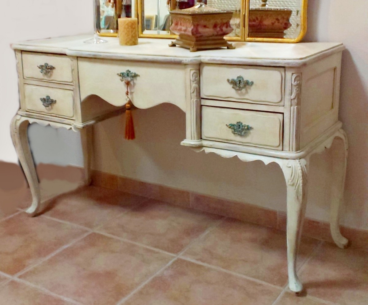 Este tipo de muebles tiene una versatilidad en cuanto a usos en decoración, este por ejemplo se ha ido a un hogar donde lo van a utilizar en el salón como mueble auxiliar de bajo de la televisión. También puede hacer las funciones de escritorio en un lugar de trabajo o hasta como mueble de baño pasando por una consola si lo ubicamos en una entrada.Si te apetece mañana te enseñaré algunas inspiraciones decorativas de estos tocadores tan versatiles.