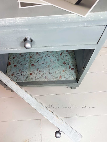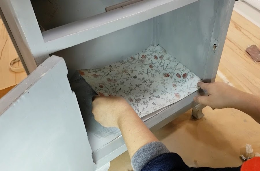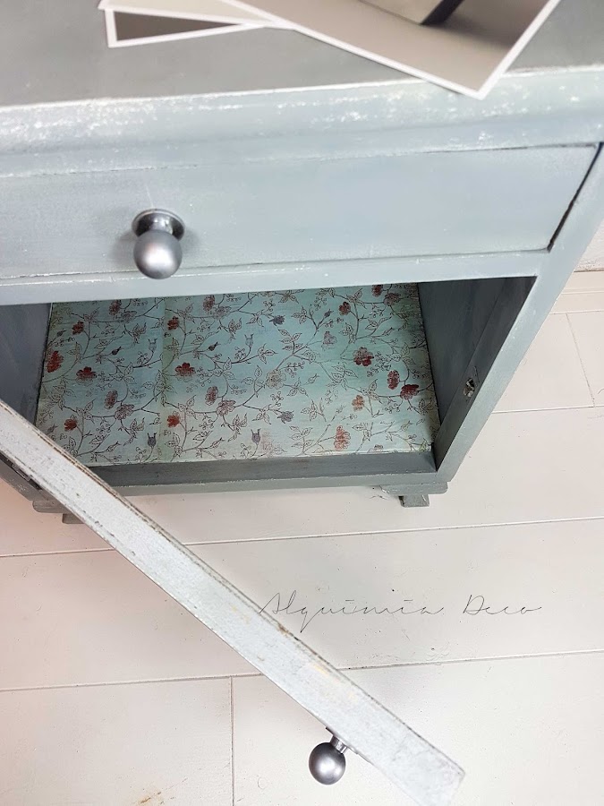 Por último, hemos forrado la parte inferior de la mesita con papel decorativo y lo hemos pegado con un poco de cola blanca.