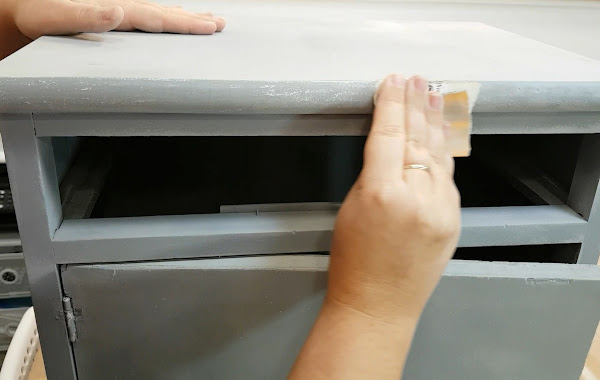 Una vez seco, hemos lijado toda la mesita y hemos insistido un poco más en las esquinas y en las partes que queríamos que se viera más el blanco de abajo, incluso hemos sacado un poco la madera natural de la mesita.