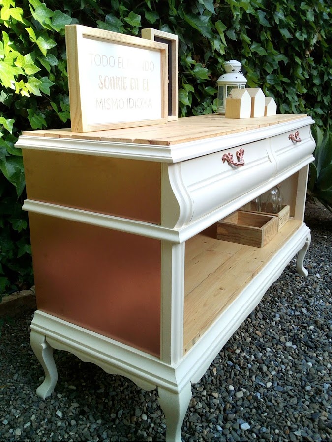 Lo bueno es que este mueble no tenía mucho que lijar así que algo me ahorré. Eso si, a la hora de pintar la cosa se puso muy chunga. Cuando pinté el mueble en blanco hueso todo iba genial pero le llegó la hora de ponerle los laterales en cobre y se desató el infierno ajaja. Esta pintura con efecto metalizado queda muy guay pero para aplicarla es bastante delicada porque al ser en spray el grosor de la capa de pintura es mínimo y se notaban mucho las imperfecciones. Hasta 7 veces tuve que repasarla pero buen viendo el resultado mereció la pena.