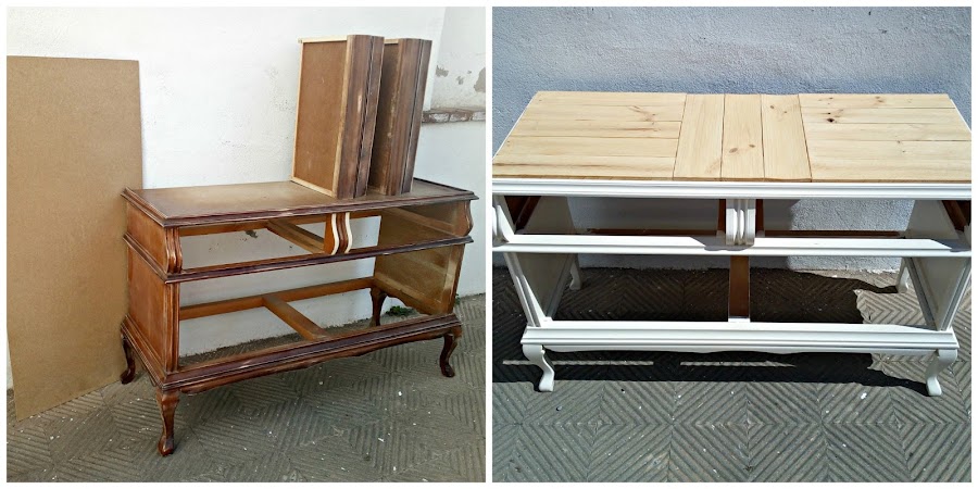 Lo primero de todo fue desmontar lo que no necesitaba o estaba mal. Como no iba a necesitar los soportes para los cajones inferiores, pues los quité y como la parte trasera ya sabéis como estaba pues fuera también. Lo siguiente ya sabéis lo que es, los famosísimos 4 pasos mágicos que os he contado alguna vez: lijar, imprimar, pintar y barnizar. Con esto pasos podemos hacer cualquier cosa menos la declaración de la renta y alguna cosita mas jajaja.