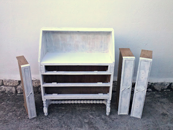 Este mueble tiene una historia curiosa detrás. Fina se encontró este mueble en un contenedor cercano a su casa y tras estar un buen rato mirándolo pensó, "este mueble puedo arreglarlo y colocarlo en mi casa". Pues se lo llevó casa y la falta de tiempo hizo que no pudiera ponerse a arreglarlo. Así que se quedó guardado en un rincón hasta que descubrió el blog y vio los muebles que yo recuperaba. Pensó que era hora de recuperarlo y me llamó. Y cuando fui a recogerlo reconocí a Fina. Ella fue profesora mía en el instituto y desde luego como dicen, el mundo es un pañuelo. Fue desde luego una bonita coincidencia.
