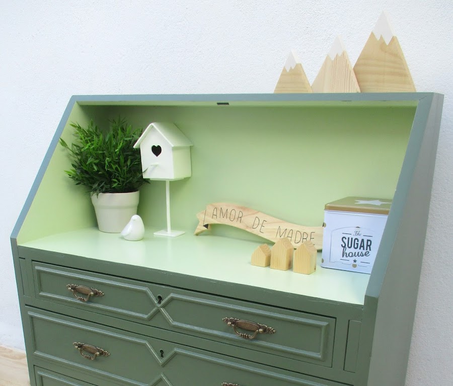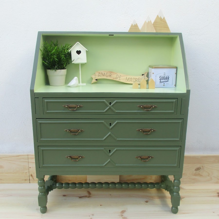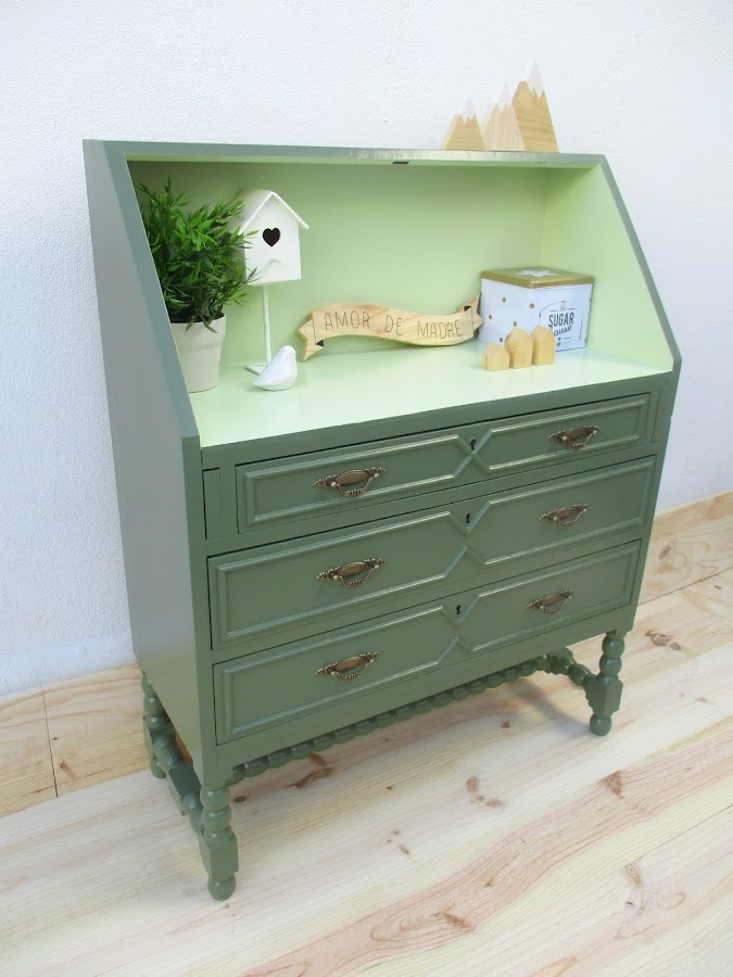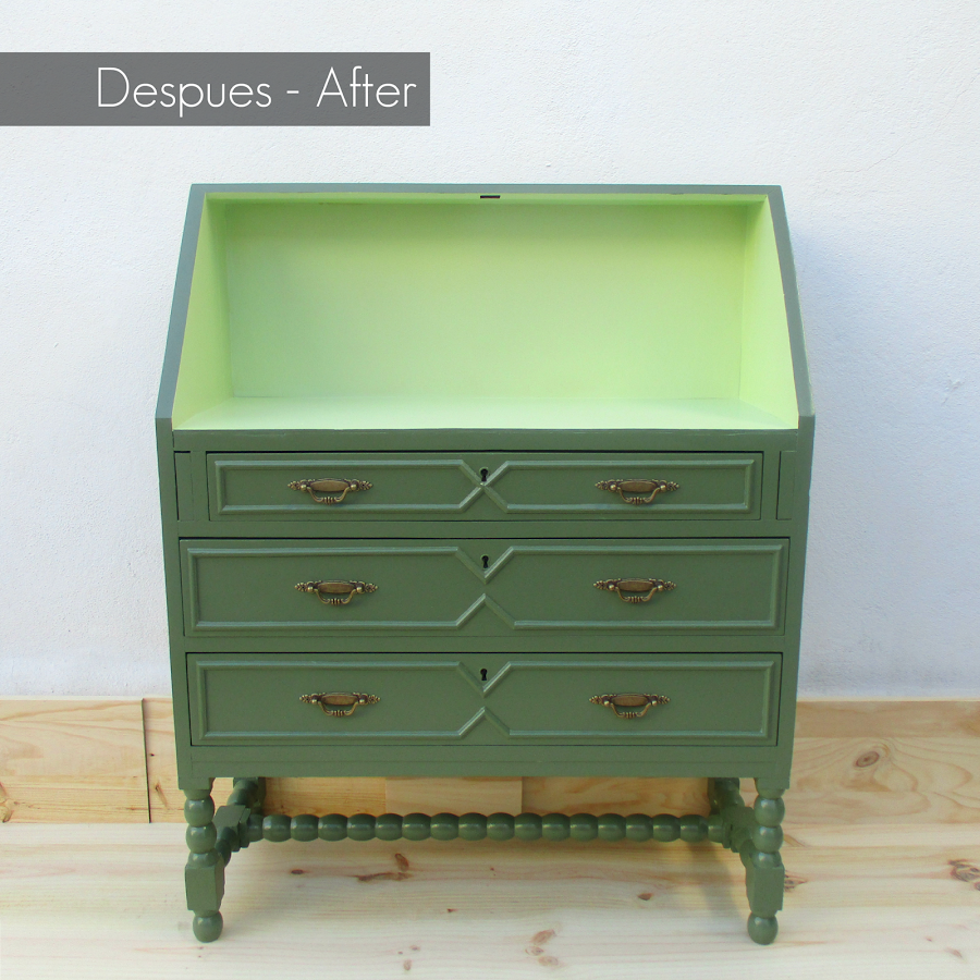 Una capa de imprimación y después..... el color. Quizás esta sea una de las partes mas placenteras de todo el proceso porque significa que ya estamos cerca del final y porque es cuando comenzamos a el los frutos de todo el esfuerzo realizado. Como Fina quería que el mueble fuera verde, elegí este bonito verde caqui al que le di un poco de contraste pintando una parte del mueble en verde mint. Y como veis la combinación queda preciosa . Le da un toque actual sin perder su carácter clásico.