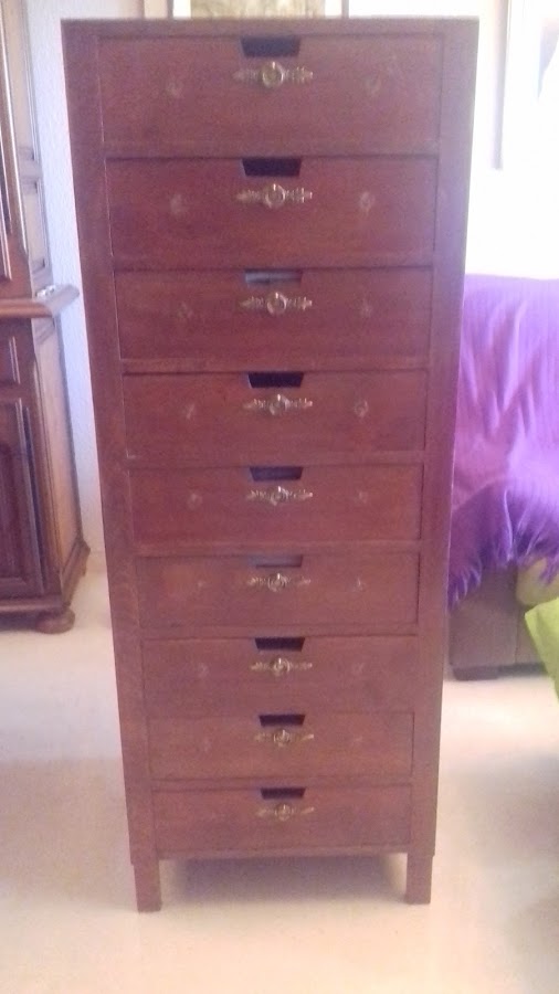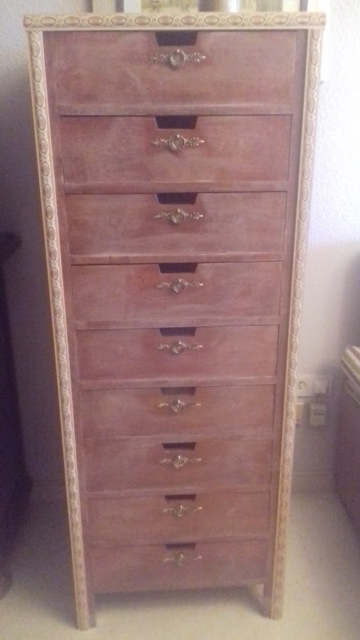 Hace algunos años mi madre me dió una comodilla ( así se llamaban antiguamente las cajoneras de los armarios empotrados), de cajones de madera maciza que yo metí dentro de un armario del dormitorio de mi Alicia. Ahí ha estado mucho tiempo dando su utilidad. Pero en las casas todo va cambiando y ahora, a mi hija le hacía falta el armario para colgar abrigos, almacenar zapatos etc; ya os imagináis la cantidad de ropa que siempre tenemos.