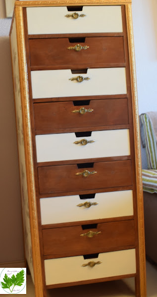 Cuando las molduras estuvieron bien pegadas, las pinté en dorado viejo y alterné la pintura a la tiza con el barníz en los cajones.