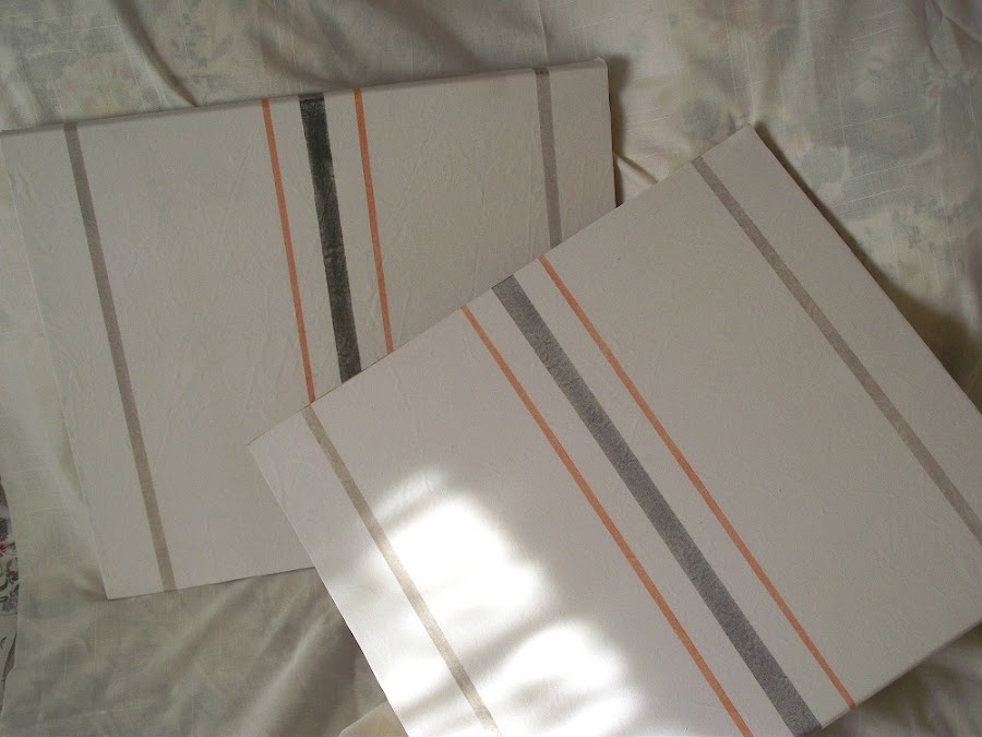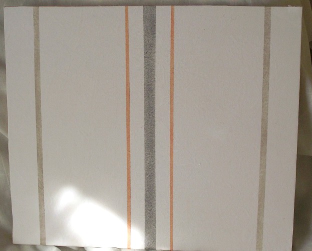 Las baldas las entelé con una loneta en color crudo. Lo hice de la siguiente manera: una vez que la tela estuvo preparada (en este tutorial os expliqué cómo se hace) pinté unas líneas con la técnica de pincel seco, ayudándome de la cinta de carrocero y utilizando las mismas pinturas que para el exterior de los cajones y las puertas. Tengo pendiente hacer un tutorial sobre esta técnica de líneas en los tejidos, es muy fácil y quedan los trabajos muy bonitos.