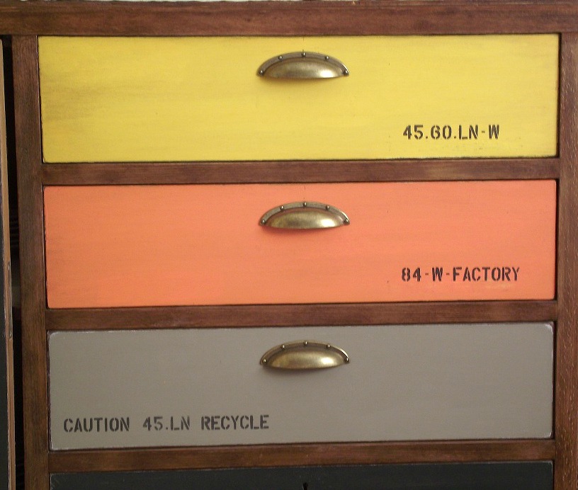 Para conseguir el efecto de mueble industrial primero pinté los cajones cada uno de un color: amarillo, naranja, topo y pizarra. Las puertas y los laterales del mueble los pinté en color pizarra. Desgasté ligeramente los bordes, tanto de los cajones como de las puertas y para finalizar una mano de cera ligeramente oscurecida con betún de judea. La cera oscurece la madera que ha quedado al descubierto y la protege, dándole el brillo satinado tan característico. Encima de la pintura de los cajones proporciona un aspecto envejecido acorde con el resto del mueble.