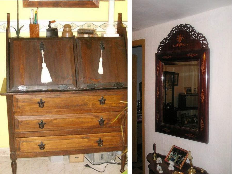 Nuestra amiga tiene en su casa muchos enseres recogidos, como este precioso espejo. Es el caso también de Apaña, una incansable rescatadora. El buró estaba sin las puertas de arriba, tenía sólo cajones, y la artista encargó a un carpintero las piezas que faltaban. "Le puse unos tiradores y ya está, ahora lo tengo en el salón".