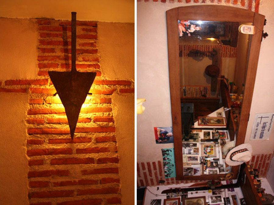 ¡Hay gran variedad de enseres aguardándonos! Nucarockman nos cuenta que es "muy basurillas", y continuamente restaura cosas pendientes, repartidas por la casa. "En unas escombreras de un pueblo encontramos creo que las piezas de un arado, son cinco, de hierro y de diferentes tamaños, estaban sueltas y no sé como iban montadas. Las hemos ido colocando en la pared de la bodega como apliques de luz y dan una luz muy agradable".