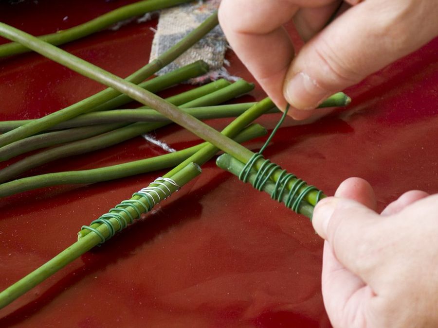 Iniciamos la tarea montando las patas de la araña. ¡Es la función que desempeñarán las flores artificiales! Mejor dicho, los tallos: llevan un alambre en el interior, por lo que podemos darles con toda facilidad la forma articulada propia de los insectos. Los acoplamos por parejas con alambre.